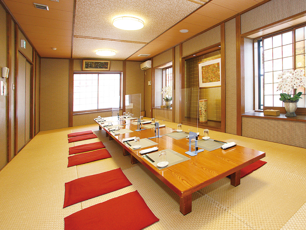 お慶びごとやご法事などのお集まりの人数に合わせてご利用いただけます。 大広間や洋室など大小のお部屋をご用意しております また、換気や飛沫防止ボードなどの予防対策も万全です